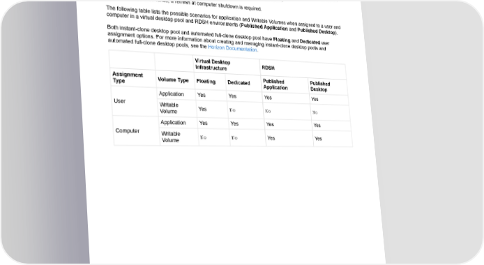 Installing App Volumes Supported App Volumes Scenarios The information presented here lists the possible and supported scenarios of applications and Writable Volumes assigned to user and computer entities with different types of virtual desktop pools. This information also includes the supported Omnissa App Volumes scenarios when used in RDSH environments. Note: For RDSH scenarios, a refresh at computer shutdown is required. The following table lists the possible scenarios for application and Writable Volumes when assigned to a user and computer in a virtual desktop pool and RDSH environments (Published Application and Published Desktop). Both instant-clone desktop pool and automated full-clone desktop pool have Floating and Dedicated user assignment options. For more information about creating and managing instant-clone desktop pools and automated full-clone desktop pools, see the Horizon Documentation. Virtual Desktop RDSH Infrastructure Assignment Volume Type Floating Dedicated Published Published Type Application Desktop Application Yes Yes Yes Yes User Writable Yes No No No Volume Application Yes Yes Yes Yes Computer Writable No No Yes Yes Volume ©2024 Omnissa. All Rights Reserved 44