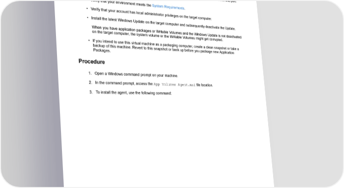 Installing App Volumes non-persistent virtual machine. By default, the value of this parameter is 1. For more information about using App Volumes on a persistent virtual desktop, see Using App Volumes on a Persistent Virtual Desktop. Prerequisites • Ensure that you have installed the App Volumes Manager and you have the host IP address and port number. • Verify that your environment meets the System Requirements. • Verify that your account has local administrator privileges on the target computer. • Install the latest Windows Update on the target computer and subsequently deactivate the Update. When you have application packages or Writable Volumes and the Windows Update is not deactivated on the target computer, the system volume or the Writable Volumes might get corrupted. • If you intend to use this virtual machine as a packaging computer, create a clean snapshot or take a backup of this machine. Revert to this snapshot or back up before you package new Application Packages. Procedure 1. Open a Windows command prompt on your machine. 2. In the command prompt, access the App Volumes Agent.msi file location. 3. To install the agent, use the following command: ©2024 Omnissa. All Rights Reserved 39