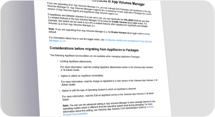 Upgrading App Volumes Components • Administrators cannot use the new functionality of the App Volumes Manager console until all App Volumes Manager instances within the cluster are upgraded to the desired version. • Before performing a rolling upgrade, all App Volumes Manager instances must be on the same version. • After upgrading the App Volumes Manager to the desired version, rolling back the upgrade might result in loss of new data that was created or updated in the database during the upgrade process. • App Volumes Agent must be upgraded only after upgrading all App Volumes Manager servers. Managing Packages and AppStacks in App Volumes Manager If you are upgrading from App Volumes Manager 2.x, you can manage both Packages and AppStacks in the App Volumes Manager UI. App Volumes Manager supports the co-existence of both Application Packages (for current version of App Volumes Agent) and AppStacks (App Volumes Agent 2.x). If AppStacks and Writable Volumes (2.x) are not in use, you can deactivate the VOLUMES (2.X) tab and other 2.x-related features in the App Volumes Manager UI by using the Enable Volumes (2.x) toggle switch. For example, this switch can be used to turn off 2.x-related features after migrating the AppStacks and Writable Volumes (2.x) from App Volumes Manager 2.x. Note: If you are upgrading from App Volumes Manager 2.x, the Enable Volumes (2.x) toggle switch is on by default. For information about how to use the toggle switch, see Configuring visibility and management of App Volumes Manager 2.x UI. Considerations before migrating from AppStacks to Packages The following AppStack functionalities are not available when managing Application Packages: • Limiting AppStack attachments. For more information, read the Limiting AppStack Attachments section in the Omnissa App Volumes 2.18 Admin Guide. • Option to attach an AppStack immediately. For more information, read the Assign an AppStack to a User section in the Omnissa App Volumes 2.18 Admin Guide. • Option to edit the type of Operating System to which an AppStack is attached. For more information, read the Edit an AppStack section in the Omnissa App Volumes 2.18 Admin Guide. Note: You can use the advanced setting in App Volumes Manager to allow package delivery to any operating system which is different from the operating system used during packaging. For more information about this setting, see Omnissa App Volumes 2103 Administration Guide at Omnissa Product Documentation. • AppStacks precedence For more information, read the AppStacks Precedence section in the Omnissa App Volumes 2.18 Admin Guide. • Reassign a Computer Writable Volume For more information, read the Reassign a Writable Volume to a Computer section in the Omnissa App Volumes 2.18 Admin Guide. ©2024 Omnissa. All Rights Reserved 48