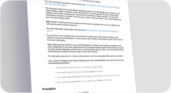 Installing App Volumes Prerequisites • Ensure that you have read through the Configuration Scenarios of Azure Virtual Desktop Integration with App Volumes Manager. See Configuration Scenarios of Azure Virtual Desktop Integration with App Volumes Manager. • Ensure that you are aware of the requirements necessary for this workflow. For more information about these requirements, see Prerequisites for Deploying App Volumes Manager through Azure Marketplace. • The resources which can be automatically deployed as part of Azure Marketplace are as follows: Azure virtual machine, public IP address, Azure virtual network, Azure storage and file share, Azure private endpoint, and network security group. Ensure that you are aware of these resources. The rest of the components required is as follows: resource group, subnet, network interface, Azure virtual desktop host pool, and App Volumes agent. Note: Public IP address and Azure storage and file share are deployed only if you have opted for the automatic provision of these resources. For more information about these resources, see Resources used in App Volumes Deployment on Azure. • If you want to use an existing virtual network when configuring the basic details for deploying App Volumes using Azure Marketplace, ensure that you have created a virtual network which can be used in the Azure subscription. When deploying App Volumes in the Azure Marketplace, the same virtual network is required so that other components in the Azure infrastructure such as virtual machines (active directory domain services and App Volumes Manager) and file share can communicate with each other. It is recommended that all virtual machines reside in the same region as the virtual network. For information about how to create a virtual network, see the corresponding Microsoft documentation. • If you intend to integrate App Volumes Manager with Azure Virtual Desktop, then ensure that you have the following permissions: ◦ Microsoft.Authorization/roleDefinitions/write ◦ Microsoft.Authorization/roleAssignments/write ◦ Microsoft.ManagedIdentity/userAssignedIdentities/assign/action ◦ Microsoft.ManagedIdentity/userAssignedIdentities/read Procedure 1. In the Microsoft Azure portal, click Marketplace. 2. Search for the App Volumes: Apps on Demand offer. 3. Click the offer. 4. Follow the prompts. 5. Click Create. ©2024 Omnissa. All Rights Reserved 25