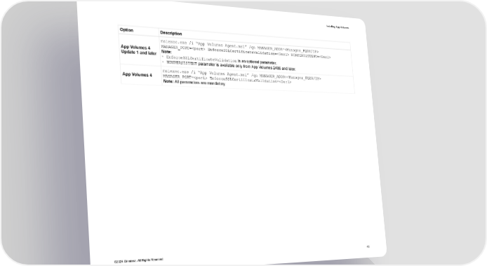 Installing App Volumes Option Description msiexec.exe /i “App Volumes Agent.msi” /qn MANAGER_ADDR= App Volumes 4 MANAGER_PORT= EnforceSSLCertificateValidation= NONPERSISTENT= Update 1 and later Note: ◦ EnforceSSLCertificateValidation is an optional parameter. ◦ NONPERSISTENT parameter is available only from App Volumes 2406 and later. msiexec.exe /i “App Volumes Agent.msi” /qn MANAGER_ADDR= App Volumes 4 MANAGER_PORT= EnforceSSLCertificateValidation= Note: All parameters are mandatory. ©2024 Omnissa. All Rights Reserved 40