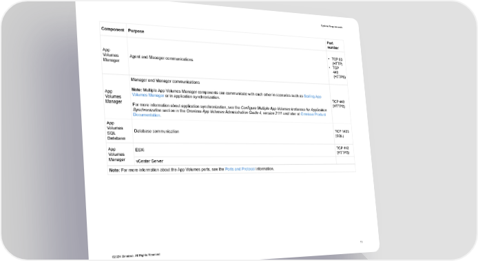 System Requirements Component Purpose Port number • TCP 80 App (HTTP) Volumes Agent and Manager communications • TCP Manager 443 (HTTPS) Manager and Manager communications App Note: Multiple App Volumes Manager components can communicate with each other in scenarios such as Scaling App Volumes Volumes Manager or in application synchronization. TCP 443 Manager (HTTPS) For more information about application synchronization, see the Configure Multiple App Volumes Instances for Application Synchronization section in the Omnissa App Volumes Administration Guide 4, version 2111 and later at Omnissa Product Documentation. App Volumes Database communication TCP 1433 SQL (SQL) Database App ESXi TCP 443 Volumes (HTTPS) Manager vCenter Server Note: For more information about the App Volumes ports, see the Ports and Protocol information. ©2024 Omnissa. All Rights Reserved 11