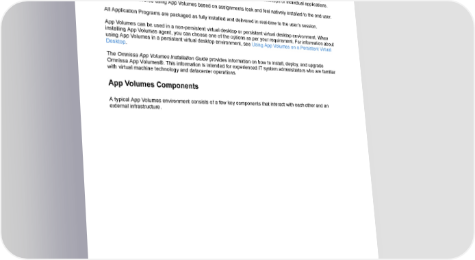Introduction to App Volumes Introduction to App Volumes Omnissa App Volumes provides a system to deliver applications to desktops through virtual disks. Applications are delivered by attaching a standard VMDK or VHD file to a virtual machine. You can centrally manage the applications with App Volumes Manager and there is no need to modify the desktops or individual applications. Applications delivered using App Volumes based on assignments look and feel natively installed to the end user. All Application Programs are packaged as fully installed and delivered in real-time to the user’s session. App Volumes can be used in a non-persistent virtual desktop or persistent virtual desktop environment. When installing App Volumes agent, you can choose one of the options as per your requirement. For information about using App Volumes in a persistent virtual desktop environment, see Using App Volumes on a Persistent Virtual Desktop. The Omnissa App Volumes Installation Guide provides information on how to install, deploy, and upgrade Omnissa App Volumes®. This information is intended for experienced IT system administrators who are familiar with virtual machine technology and datacenter operations. App Volumes Components A typical App Volumes environment consists of a few key components that interact with each other and an external infrastructure. ©2024 Omnissa. All Rights Reserved 4