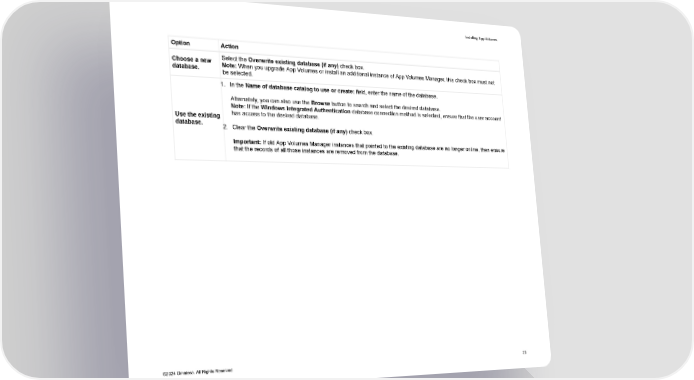 Installing App Volumes Option Action Choose a new Select the Overwrite existing database (if any) check box. database. Note: When you upgrade App Volumes or install an additional instance of App Volumes Manager, this check box must not be selected. 1. In the Name of database catalog to use or create: field, enter the name of the database. Alternately, you can also use the Browse button to search and select the desired database. Note: If the Windows Integrated Authentication database connection method is selected, ensure that the user account Use the existing has access to the desired database. database. 2. Clear the Overwrite existing database (if any) check box. Important: If old App Volumes Manager instances that pointed to the existing database are no longer online, then ensure that the records of all those instances are removed from the database. ©2024 Omnissa. All Rights Reserved 20