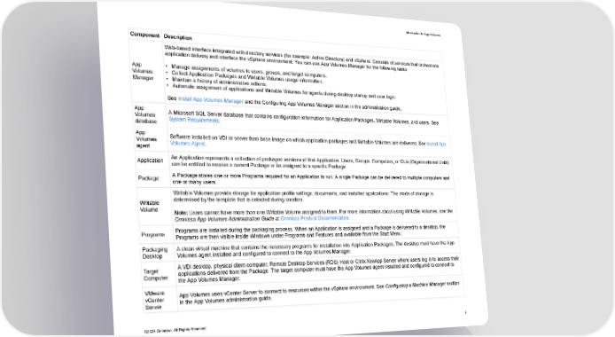 Introduction to App Volumes Component Description Web-based interface integrated with directory services (for example: Active Directory) and vSphere. Consists of services that orchestrate application delivery and interface the vSphere environment. You can use App Volumes Manager for the following tasks: App • Manage assignments of volumes to users, groups, and target computers. Volumes • Collect Application Packages and Writable Volumes usage information. Manager • Maintain a history of administrative actions. • Automate assignment of applications and Writable Volumes for agents during desktop startup and user login. See Install App Volumes Manager and the Configuring App Volumes Manager section in the administration guide. App A Microsoft SQL Server database that contains configuration information for Application Packages, Writable Volumes, and users. See Volumes System Requirements. database App Software installed on VDI or server farm base image on which application packages and Writable Volumes are delivered. See Install App Volumes Volumes Agent. agent Application An Application represents a collection of packaged versions of that Application. Users, Groups, Computers, or OUs (Organizational Units) can be entitled to receive a current Package or be assigned to a specific Package. Package A Package stores one or more Programs required for an Application to run. A single Package can be delivered to multiple computers and one or many users. Writable Volumes provide storage for application profile settings, documents, and installed applications. The mode of storage is Writable determined by the template that is selected during creation. Volume Note: Users cannot have more than one Writable Volume assigned to them. For more information about using Writable Volumes, see the Omnissa App Volumes Administration Guide at Omnissa Product Documentation. Programs Programs are installed during the packaging process. When an Application is assigned and a Package is delivered to a desktop, the Programs are then visible inside Windows under Programs and Features and available from the Start Menu. Packaging A clean virtual machine that contains the necessary programs for installation into Application Packages. The desktop must have the App Desktop Volumes agent installed and configured to connect to the App Volumes Manager. Target A VDI desktop, physical client computer, Remote Desktop Services (RDS) Host or Citrix XenApp Server where users log in to access their Computer applications delivered from the Package. The target computer must have the App Volumes agent installed and configured to connect to the App Volumes Manager. VMware App Volumes uses vCenter Server to connect to resources within the vSphere environment. See Configuring a Machine Manager section vCenter in the App Volumes administration guide. Server ©2024 Omnissa. All Rights Reserved 5