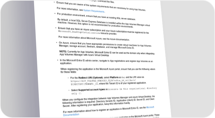 Installing App Volumes 2. Click Downloads. 3. In the All Downloads page, search for App Volumes in the Products A-Z listing and click View Download Components. 4. In the Download App Volumes page, navigate to the desired edition, and click GO TO DOWNLOADS. 5. In the Download Product page, download the files. • Ensure that you are aware of the system requirements that are necessary for using App Volumes. For more information, see System Requirements. • For production environment, ensure that you have an existing SQL server database. By default, a local SQL Server Express Database is installed within the App Volumes Manager virtual machine. However, this option is not recommended for production environments. • Ensure that you have an Azure subscription and your Azure subscription must be registered for the Microsoft.DesktopVirtualization resource provider. For more information about Microsoft Azure, see the Azure documentation. • On Azure, ensure that you have appropriate permissions to create virtual machines for App Volumes Manager, storage account, fileshare, database, and manage Microsoft Entra ID. NOTE: Currently for App Volumes, Microsoft Entra ID can be used as the domain only when integrating App Volumes Manager with Azure Virtual Desktop. • In the Microsoft Entra ID admin center, navigate to App registrations and register App Volumes as an application. When registering the application in the Microsoft Azure portal, ensure that you use the following values for these fields: ◦ For the Redirect URI (Optional), select Platform as Web and the URI value as https://APP_VOLUMES_MANAGER_FQDN/entra_id_callback/ DIRECTORY(TENANT)_ID, where the Tenant ID is of your registered application. ◦ Select Supported account types as Accounts in this organizational directory only (). When you configure the integration between App Volumes Manager and Azure Virtual Desktop, the following information is required: Directory (tenant) ID, Application (client) ID, Secret ID, and Client Secret. After registering your application, keep this information handy. For more information about how to register an application in Microsoft Entra ID, see the Microsoft Documentation • Assign necessary API permissions to the App Volumes application in the Microsoft Azure portal. These permissions are required for the application to perform tasks in Azure. Go to the registered application and add the following Microsoft Graph API permissions to the application: Application.Read.All, Device.Read.All, GroupMember.Read.All, User.Read.All, and User.Read. Note: User.Read is a Delegated permission whereas the others are Application permissions. ◦ Ensure that you grant admin consent for these permissions. To grant admin consent, you must either be in an administrator role or a user with enough permissions to grant consent. ©2024 Omnissa. All Rights Reserved 35