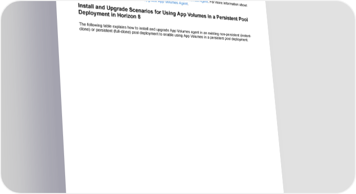 Installing App Volumes backup of this machine. Revert to this snapshot or the backup before packaging new application packages. • Writable Volumes must not be used on a persistent virtual desktop. If a user has a Writable Volume assignment, then such a user must not be assigned to a persistent virtual desktop. • You can install the latest Windows Update and keep the Update activated. For information about installing App Volumes agent, see Install App Volumes Agent. For more information about upgrading the App Volumes agent, see Upgrade App Volumes Agent. Install and Upgrade Scenarios for Using App Volumes in a Persistent Pool Deployment in Horizon 8 The following table explains how to install and upgrade App Volumes agent in an existing non-persistent (instant- clone) or persistent (full-clone) pool deployment to enable using App Volumes in a persistent pool deployment. ©2024 Omnissa. All Rights Reserved 13