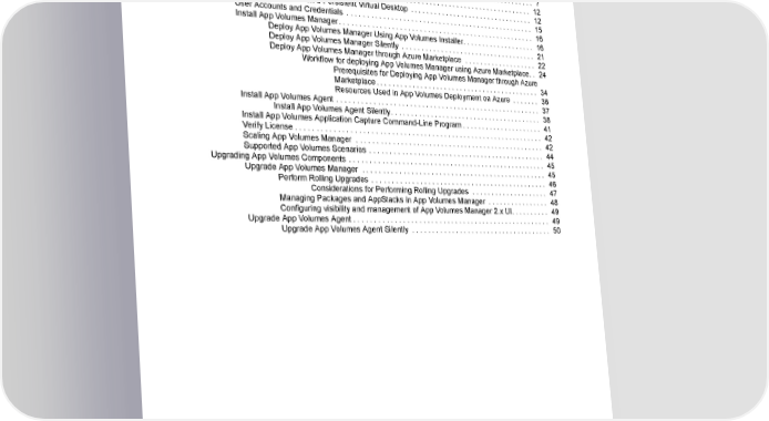 Contents About This Book . . . . . . . . . . . . . . . . . . . . . . . . . . . . . . . . . . . . . . . . . . . . . . . . . . . . . . . . . . . . . . . . . . . . 3 Introduction to App Volumes . . . . . . . . . . . . . . . . . . . . . . . . . . . . . . . . . . . . . . . . . . . . . . . . . . . . . . . . . . . 4 System Requirements . . . . . . . . . . . . . . . . . . . . . . . . . . . . . . . . . . . . . . . . . . . . . . . . . . . . . . . . . . . . . . . . 7 Installing App Volumes . . . . . . . . . . . . . . . . . . . . . . . . . . . . . . . . . . . . . . . . . . . . . . . . . . . . . . . . . . . . . . 12 Using App Volumes on a Persistent Virtual Desktop . . . . . . . . . . . . . . . . . . . . . . . . . . . . . . . . 12 User Accounts and Credentials . . . . . . . . . . . . . . . . . . . . . . . . . . . . . . . . . . . . . . . . . . . . . . . . 15 Install App Volumes Manager . . . . . . . . . . . . . . . . . . . . . . . . . . . . . . . . . . . . . . . . . . . . . . . . . . 16 Deploy App Volumes Manager Using App Volumes Installer . . . . . . . . . . . . . . . . . . . 16 Deploy App Volumes Manager Silently . . . . . . . . . . . . . . . . . . . . . . . . . . . . . . . . . . . 21 Deploy App Volumes Manager through Azure Marketplace . . . . . . . . . . . . . . . . . . . 22 Workflow for deploying App Volumes Manager using Azure Marketplace . . 24 Prerequisites for Deploying App Volumes Manager through Azure Marketplace . . . . . . . . . . . . . . . . . . . . . . . . . . . . . . . . . . . . . . . . . . 34 Resources Used in App Volumes Deployment on Azure . . . . . . . 36 Install App Volumes Agent . . . . . . . . . . . . . . . . . . . . . . . . . . . . . . . . . . . . . . . . . . . . . . . . . . . . 37 Install App Volumes Agent Silently . . . . . . . . . . . . . . . . . . . . . . . . . . . . . . . . . . . . . . . 38 Install App Volumes Application Capture Command-Line Program . . . . . . . . . . . . . . . . . . . . . 41 Verify License . . . . . . . . . . . . . . . . . . . . . . . . . . . . . . . . . . . . . . . . . . . . . . . . . . . . . . . . . . . . . . 42 Scaling App Volumes Manager . . . . . . . . . . . . . . . . . . . . . . . . . . . . . . . . . . . . . . . . . . . . . . . . 42 Supported App Volumes Scenarios . . . . . . . . . . . . . . . . . . . . . . . . . . . . . . . . . . . . . . . . . . . . . 44 Upgrading App Volumes Components . . . . . . . . . . . . . . . . . . . . . . . . . . . . . . . . . . . . . . . . . . . . . . . . . . 45 Upgrade App Volumes Manager . . . . . . . . . . . . . . . . . . . . . . . . . . . . . . . . . . . . . . . . . . . . . . . 45 Perform Rolling Upgrades . . . . . . . . . . . . . . . . . . . . . . . . . . . . . . . . . . . . . . . . . . . . . 46 Considerations for Performing Rolling Upgrades . . . . . . . . . . . . . . . . . . . . 47 Managing Packages and AppStacks in App Volumes Manager . . . . . . . . . . . . . . . . 48 Configuring visibility and management of App Volumes Manager 2.x UI . . . . . . . . . . 49 Upgrade App Volumes Agent . . . . . . . . . . . . . . . . . . . . . . . . . . . . . . . . . . . . . . . . . . . . . . . . . . 49 Upgrade App Volumes Agent Silently . . . . . . . . . . . . . . . . . . . . . . . . . . . . . . . . . . . . 50 ©2024 Omnissa. All Rights Reserved 2