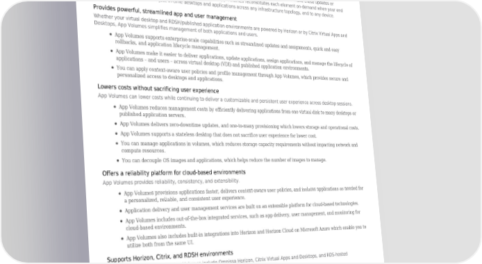 What Is App Volumes? Key benefits Traditionally, desktop components – such as applications, user data, and custom settings – were tightly coupled with the operating system. App Volumes decouples that arrangement, separating the applications into packages, which you can define. App Volumes uses an entirely different package for persisting user changes between sessions. As an IT admin, this makes it easier for you to apply updates, and to make small changes to individual applications quickly. It means you can update or modify these elements without creating a whole new desktop image, and make these updates or modifications available to your end users that much faster. App Volumes reconstitutes each element on-demand when your end users need it. You can deliver just-in-time desktops and applications across any infrastructure topology, and to any device. Provides powerful, streamlined app and user management Whether your virtual desktop and RDSH/published application environments are powered by Horizon or by Citrix Virtual Apps and Desktops, App Volumes simplifies management of both applications and users. App Volumes supports enterprise-scale capabilities such as streamlined updates and assignments, quick and easy rollbacks, and application lifecycle management. App Volumes make it easier to deliver applications, update applications, assign applications, and manage the lifecycle of applications – and users – across virtual desktop (VDI) and published application environments. You can apply context-aware user policies and profile management through App Volumes, which provides secure and personalized access to desktops and applications. Lowers costs without sacrificing user experience App Volumes can lower costs while continuing to deliver a customizable and persistent user experience across desktop sessions. App Volumes reduces management costs by efficiently delivering applications from one virtual disk to many desktops or published application servers. App Volumes delivers zero-downtime updates, and one-to-many provisioning which lowers storage and operational costs. App Volumes supports a stateless desktop that does not sacrifice user experience for lower cost. You can manage applications in volumes, which reduces storage capacity requirements without impacting network and compute resources. You can decouple OS images and applications, which helps reduce the number of images to manage. Offers a reliability platform for cloud-based environments App Volumes provides reliability, consistency, and extensibility. App Volumes provisions applications faster, delivers context-aware user policies, and isolates applications as needed for a personalized, reliable, and consistent user experience. Application delivery and user management services are built on an extensible platform for cloud-based technologies. App Volumes includes out-of-the-box integrated services, such as app delivery, user management, and monitoring for cloud-based environments. App Volumes also includes built-in integrations into Horizon and Horizon Cloud on Microsoft Azure which enable you to utilize both from the same UI. Supports Horizon, Citrix, and RDSH environments Supported environments for App Volumes include Omnissa Horizon, Citrix Virtual Apps and Desktops, and RDS-hosted environments. Horizon – App Volumes is included in Omnissa Horizon Enterprise. If you have Horizon, you have App Volumes and the real-time application delivery, application isolation, and user management features that App Volumes provides. Citrix – You can optimize your Citrix Virtual Apps and Desktop, XenApp, or XenDesktop environment with App Volumes. App Volumes allows real-time application delivery, application isolation, and user management, which can enhance your investment in XenApp and XenDesktop. RDSH – You can enhance your RDS-hosted environment with App Volumes to achieve real-time application delivery, application isolation, and user management. ©️ Omnissa LLC. Document | 7