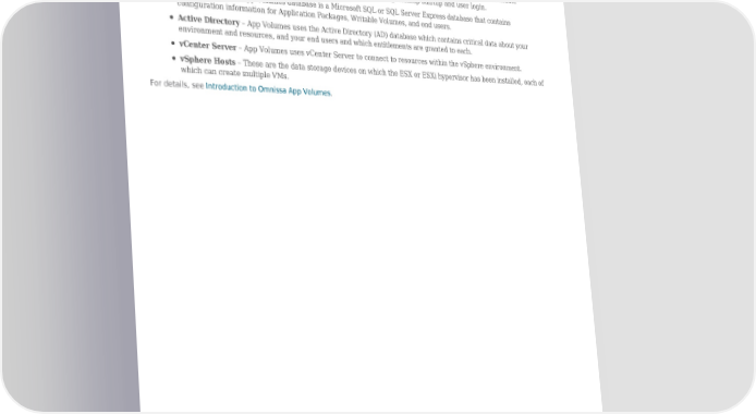 What Is App Volumes? Storage Group – You can configure Storage Groups to automatically replicate Application Packages or distribute Writable Volumes across multiple datastores. You can also use them to define a group of datastores that should all contain the same Application Packages, such as when using departmental applications. App Volumes Manager – This is the web-based interface integrated with Active Directory (AD) and vSphere, which consists of services that orchestrate application delivery and interface with the vSphere environment. You can use App Volumes Manager to manage assignments of volumes to users, groups, and target computers, collect Application Packages and Writable Volumes usage information, maintain a history of administrative actions, and automate assignment of applications and Writable Volumes for agents during desktop startup and user login. SQL Server – The App Volumes database is a Microsoft SQL or SQL Server Express database that contains configuration information for Application Packages, Writable Volumes, and end users. Active Directory – App Volumes uses the Active Directory (AD) database which contains critical data about your environment and resources, and your end users and which entitlements are granted to each. vCenter Server – App Volumes uses vCenter Server to connect to resources within the vSphere environment. vSphere Hosts – These are the data storage devices on which the ESX or ESXi hypervisor has been installed, each of which can create multiple VMs. For details, see Introduction to Omnissa App Volumes. ©️ Omnissa LLC. Document | 10